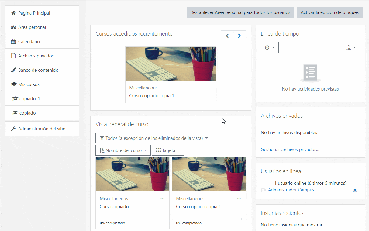 Este bloque podemos insertarlo en la Página principal de tu plataforma o en el Área personal de los usuarios, tanto para usuarios regulares (estudiantes, profesores, etc.), como administradores.